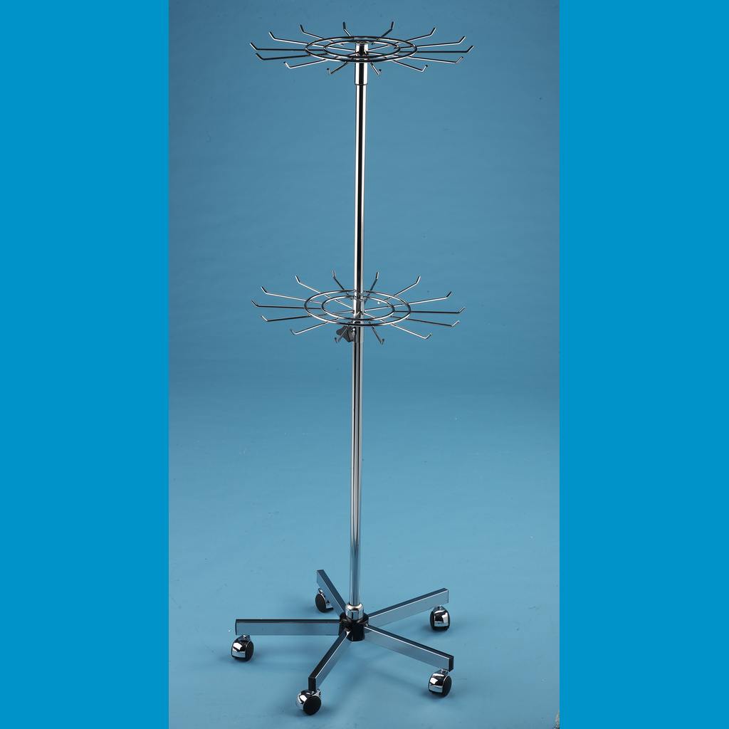 Περιστρεφόμενο σταντ με 2 στεφάνια Ø55cm με 14 γαντζάκια. Το ύψος του σταντ ρυθμίζεται από 100 ως 195 cm. Είναι τροχήλατο με πέντε ρόδες Ø50mm