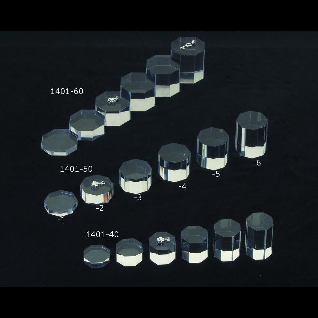 Οκτάγωνες διάφανες πλέξιγκλας βέργες σε 4×4 – 5×5 – 6x6cm και σε ύψη από 1 ως 6cm. Οι μασίφ αυτές βέργες είναι κατάλληλες για να δώσουν ύψος στα μικροαντικείμενα της βιτρίνας. Ιδανικά για κοσμήματα, μπιζού, αναπτήρες κλπ.