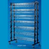Σταντ μεταλλικό για προσφορές με 14, 16 και 18 ρυθμιζόμενες σχάρες σε 4 φάρδη: 70-90-110-130cm και 3 ύψη: 160-180-200cm. Το καθαρό μήκος της σχάρας είναι αντίστοιχα 60-80-100-120cm. Η εικονιζόμενη είναι σε 110cm φάρδος. Οι σκαριέρες έχουν πλαϊνά βαφής άσπρα και σχάρες χρωμίου. Οι ρόδες τους είναι μεταλλικές Ø 80mm