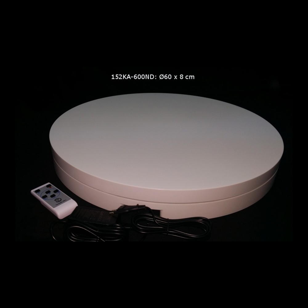 Περιστρεφόμενη ηλεκτρική βάση. Η διάμετρός της είναι 60 εκατοστά και το ύψος της 8 εκατοστά. Είναι κατασκευασμένη από πλαστικό & MDF σε χρώμα λευκό ματ και κάνει δύο στροφές στα 60¨. Η ταχύτητά της ρυθμίζεται με τηλεκοντρόλ. Σηκώνει ως 100 κιλά βάρος. Εντυπωσιακή προβολή για τη βιτρίνα κάθε είδους καταστήματος και πλέον κατάλληλη για επαγγελματική φωτογράφιση προϊόντων για ιστοσελίδες (e-shops) και διαφημίσεις