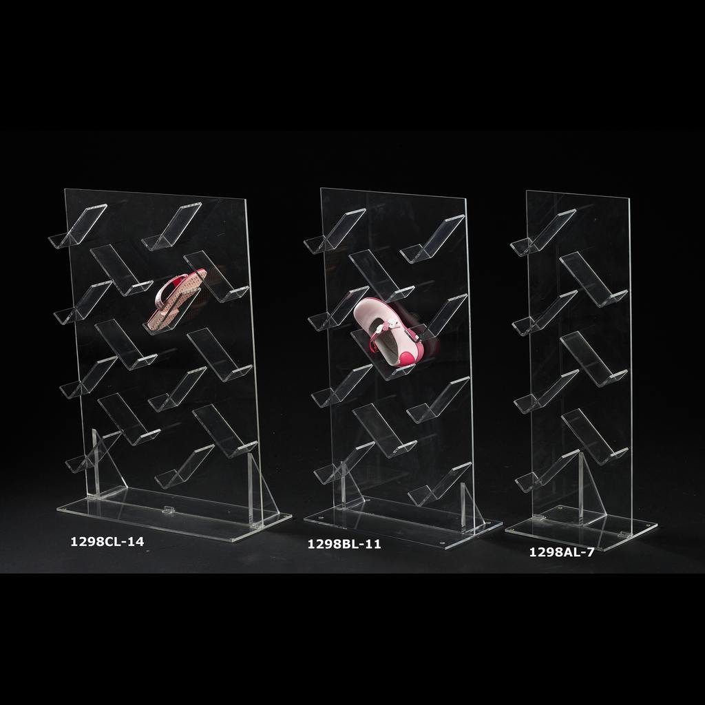 Σταντ για παιδικά παπούτσια με λοξά ραφάκια 7, 11 και 14 θέσεων. Είναι κατάλληλα τόσο για τη βιτρίνα, όσο και για το εσωτερικό του καταστήματος