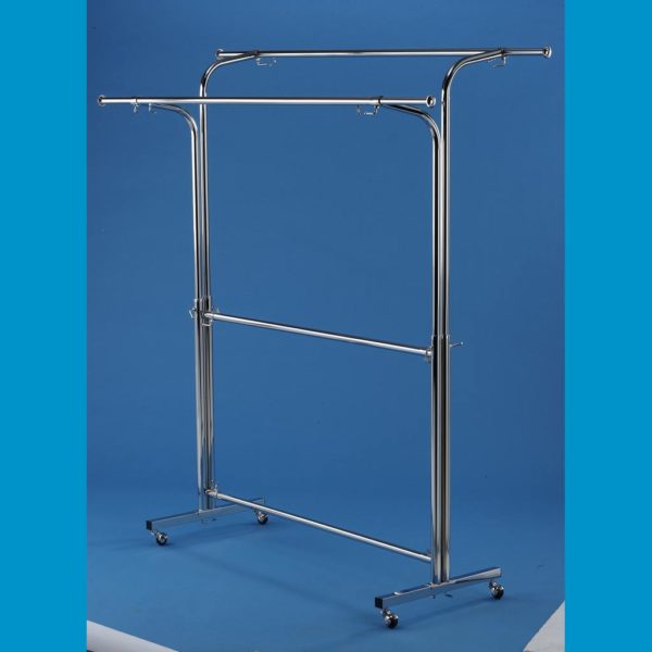 Διπλό Σταντ ρούχων τροχήλατο με προεκτάσεις που φτάνουν τα 187 εκατοστά (μέγιστο άνοιγμα). Το ύψος είναι ρυθμιζόμενο ανά 10 εκατοστά και κυμαίνεται από 142 εως 182 εκατοστά.